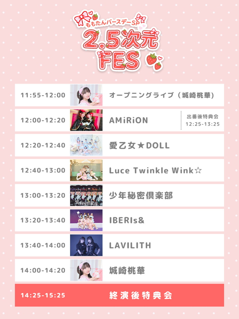 城崎桃華、AMiRiON、IBERIs&、少年秘密俱楽部、LAVILITH、愛乙女★DOLL、Luce Twinkle Wink☆(敬称略、50音順)