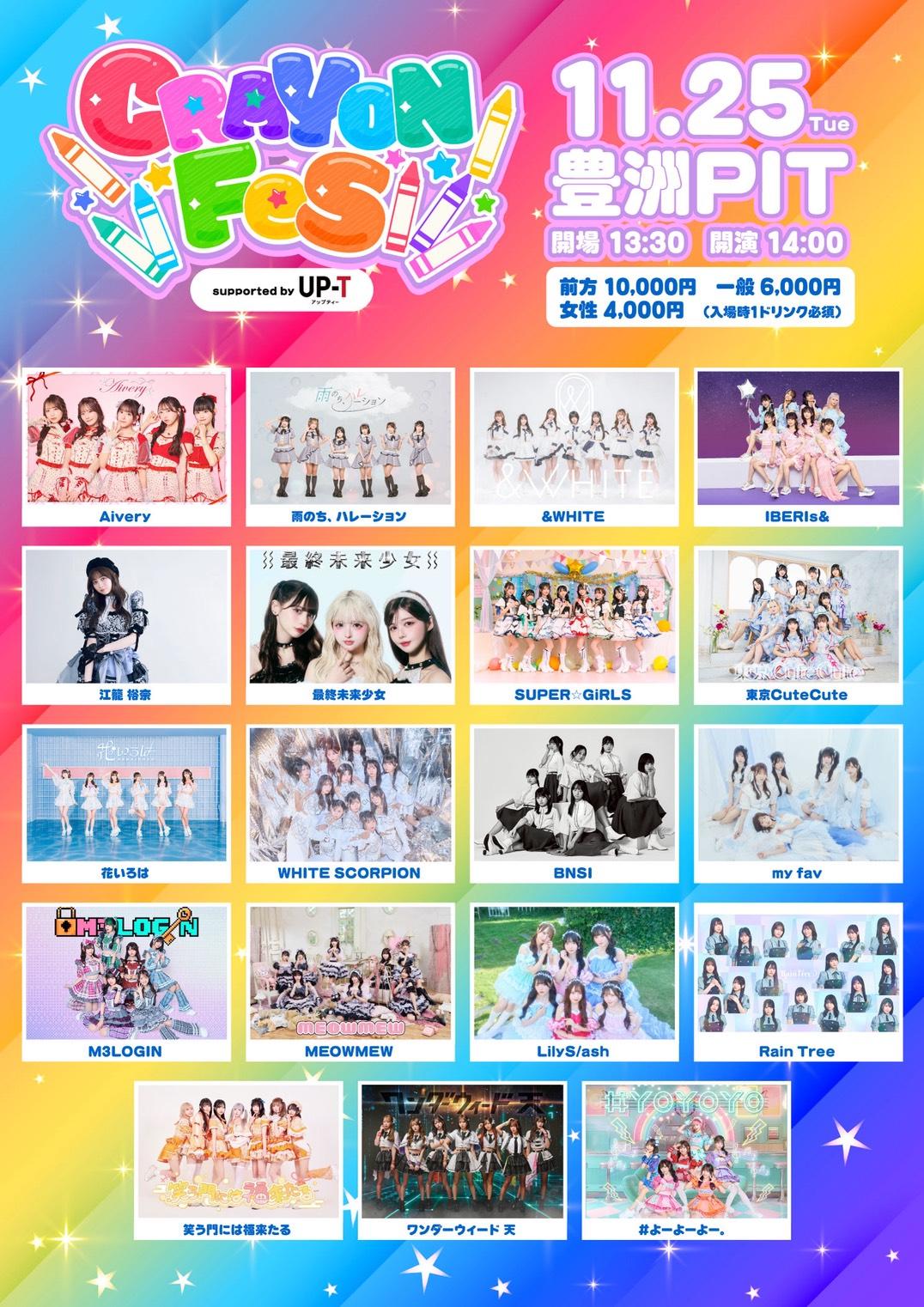 Aivery / 雨のち、ハレーション / &WHITE / IBERIs& / 江籠裕奈 / 最終未来少女 / SUPER☆GiRLS / 東京CuteCute / 花いろは / WHITE SCORPION / BNSI / my fav / M3LOGIN / MEOWMEW / LilyS/ash / Rain Tree / 笑う門には福来たる / ワンダーウィード 天 / #よーよーよー※ライヴ本編はフルメンバーでの出演をさせて頂きます。