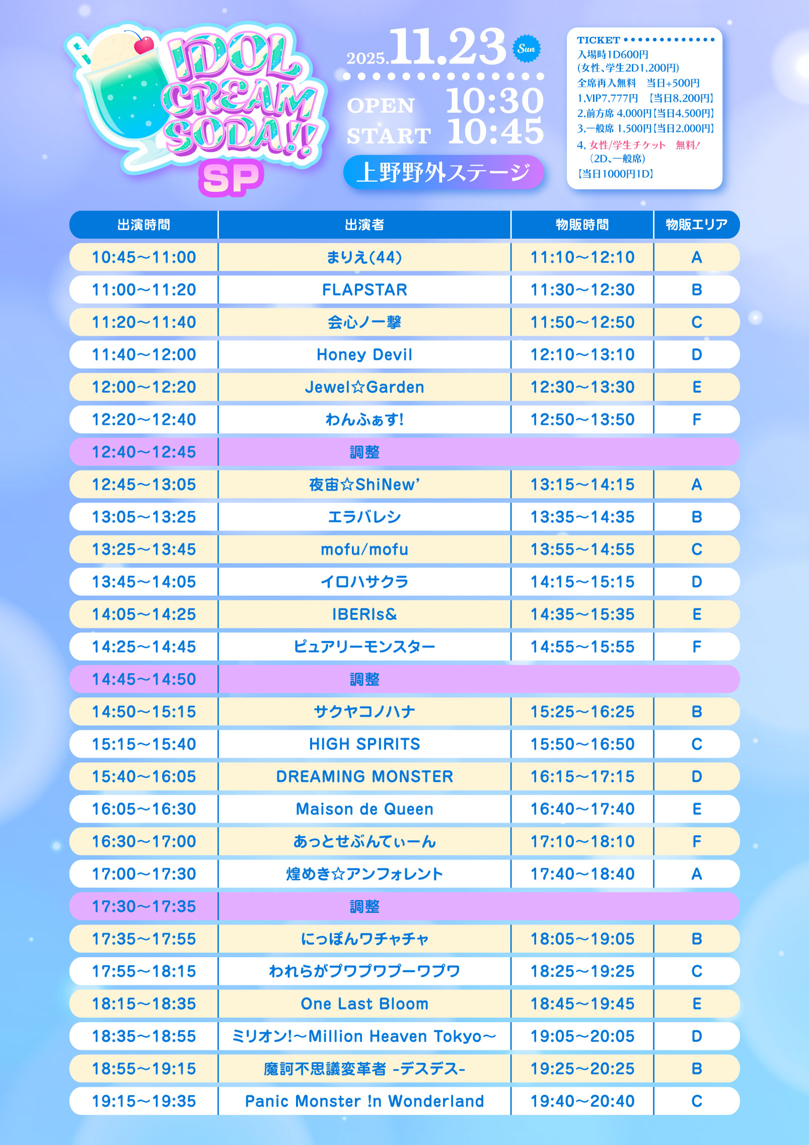 11月23日(日) 「 IDOL CREAM SODA!! SP」@上野野外ステージのタイムテーブル発表